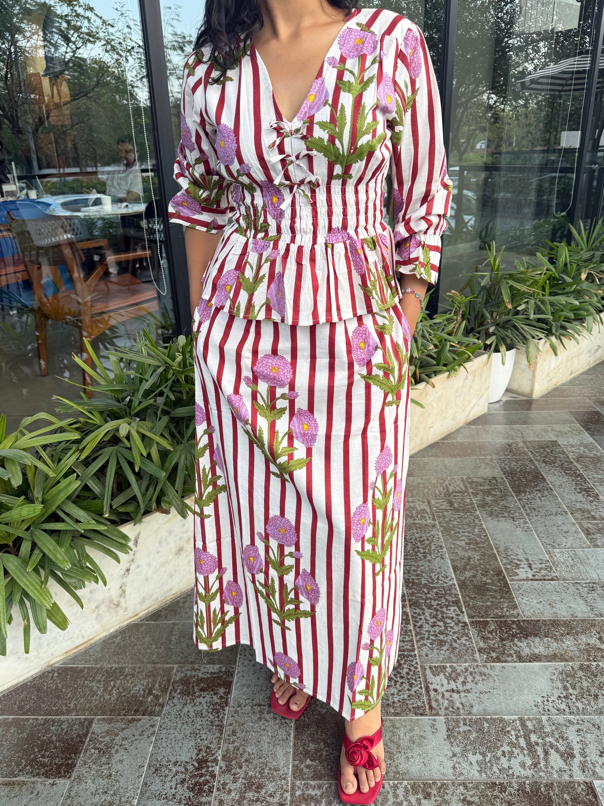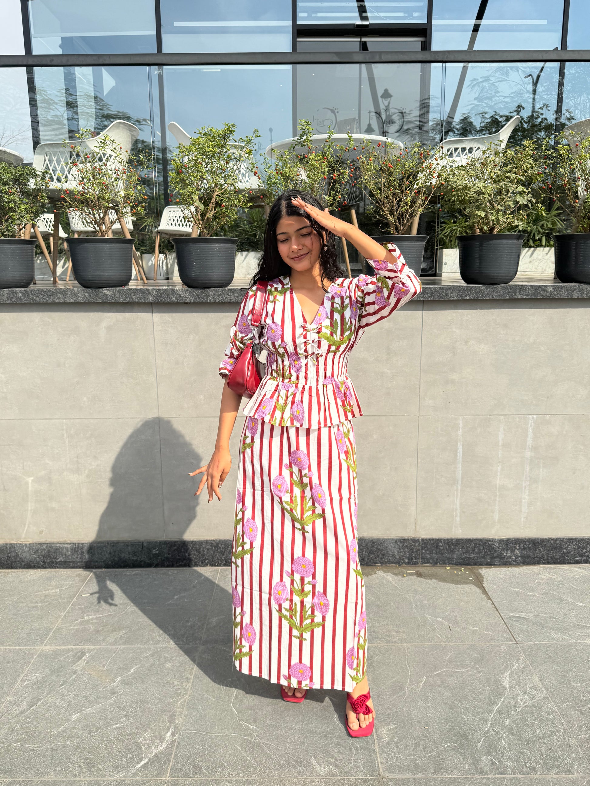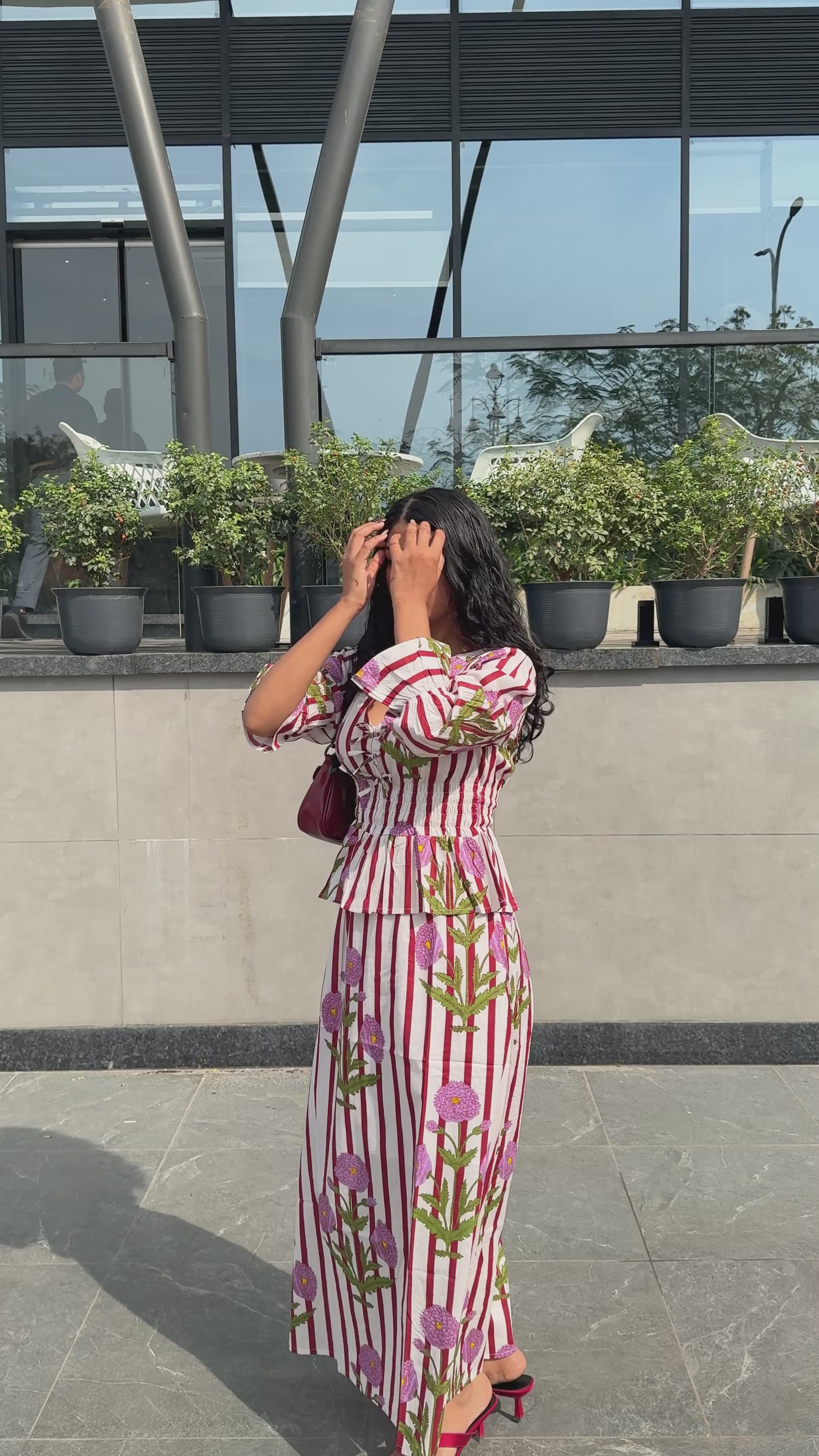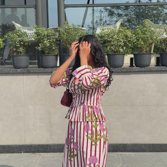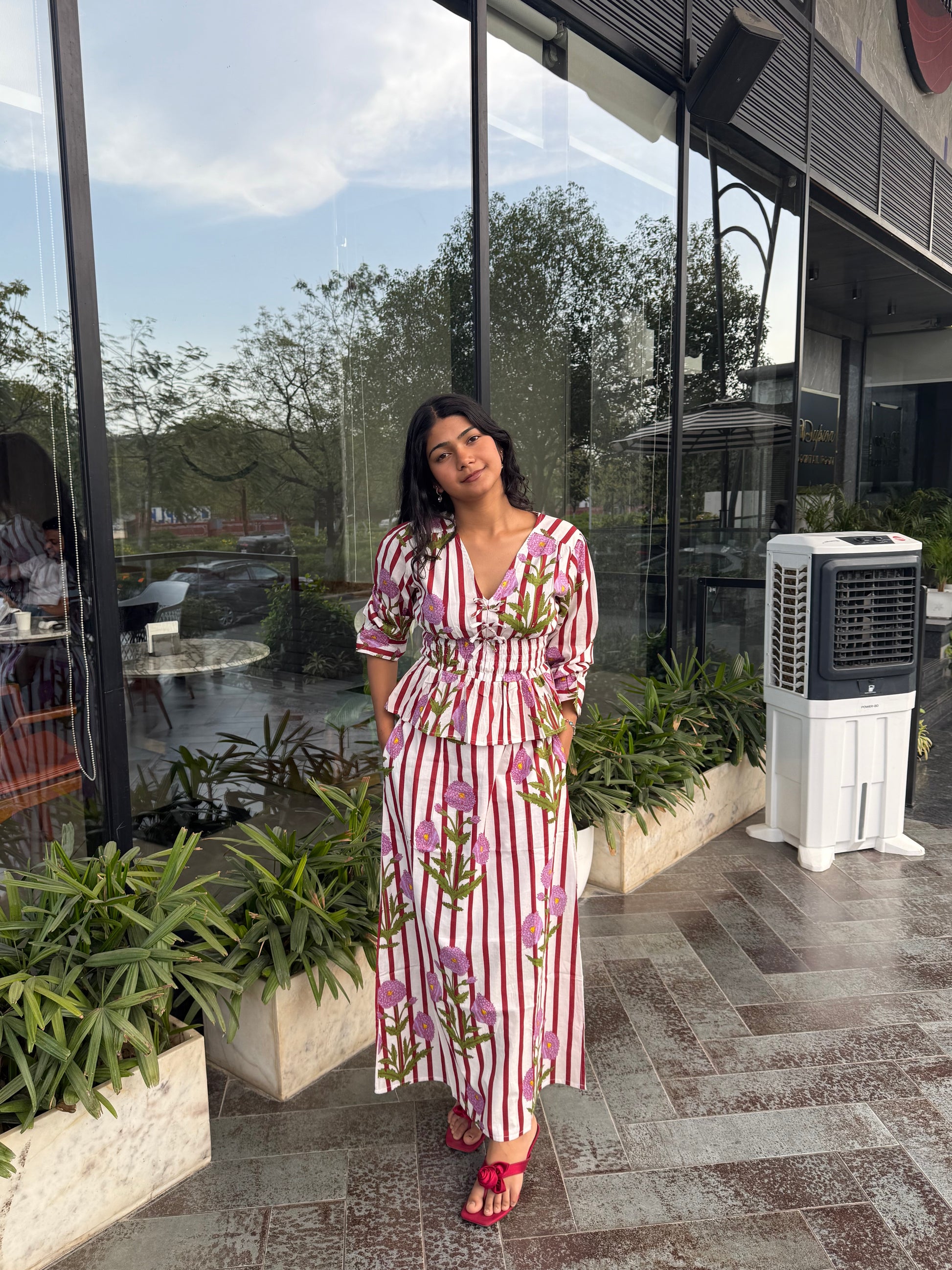 GULMOHAR SET is a Cotton Co-ord Set. Crafted from 100% pure cotton, this breathable and lightweight outfit is designed to keep you comfortable while looking effortlessly stylish. The set features delicate hand block-printed pink floral motifs placed over elegant red vertical stripes, creating a beautiful balance of traditional craftsmanship and modern design. The V-neck peplum-style top with soft gathers enhances the silhouette, while the flowy ankle-length skirt offers graceful movement and all-day comfort.